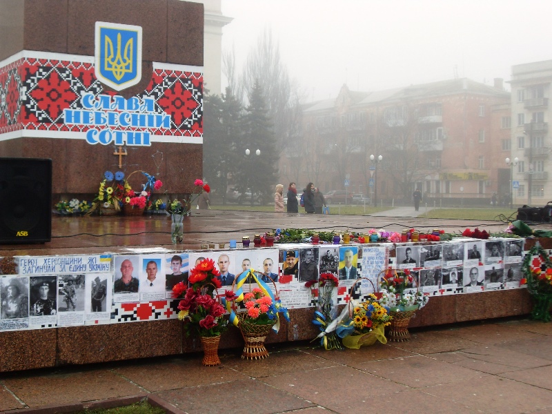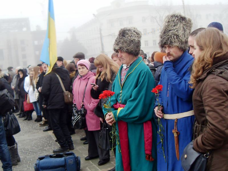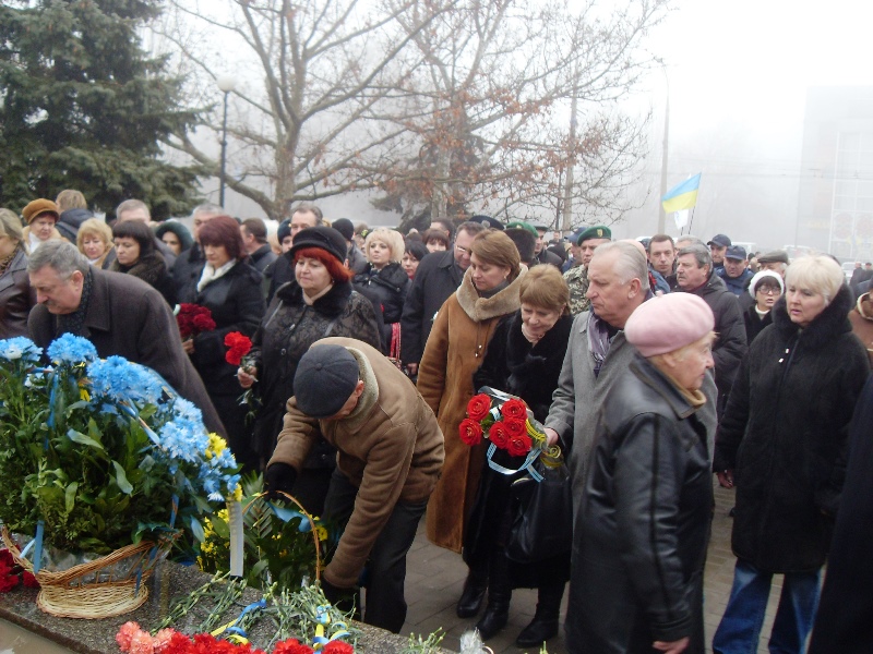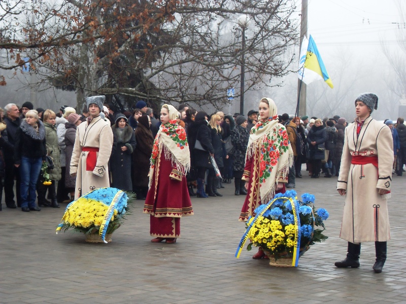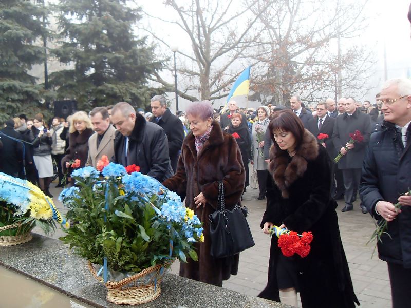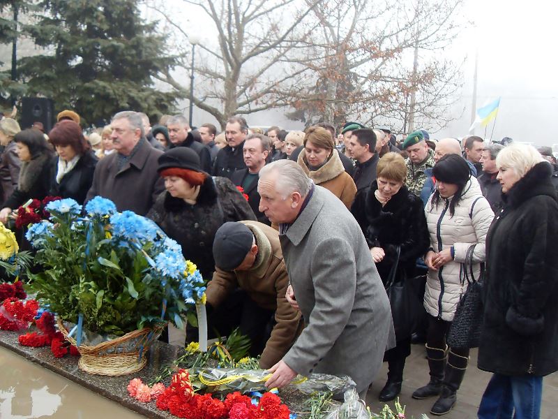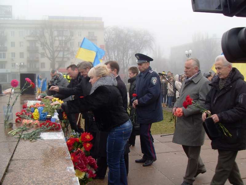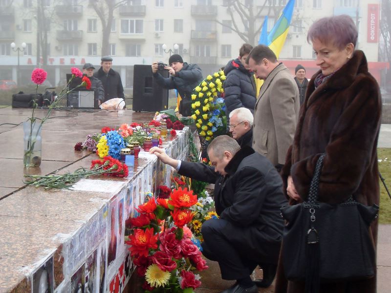 Затем участники митинга почтили память Вячеслава Черновола, а несколько позже на центральной площади города возле памятного знака Небесной Сотни состоялось возложение цветов героям. Ровно год назад, в День Соборности, 22 января 2014 года, в Киеве на Майдане от огнестрельных ранений погибли первые участники Революции Достоинства.
