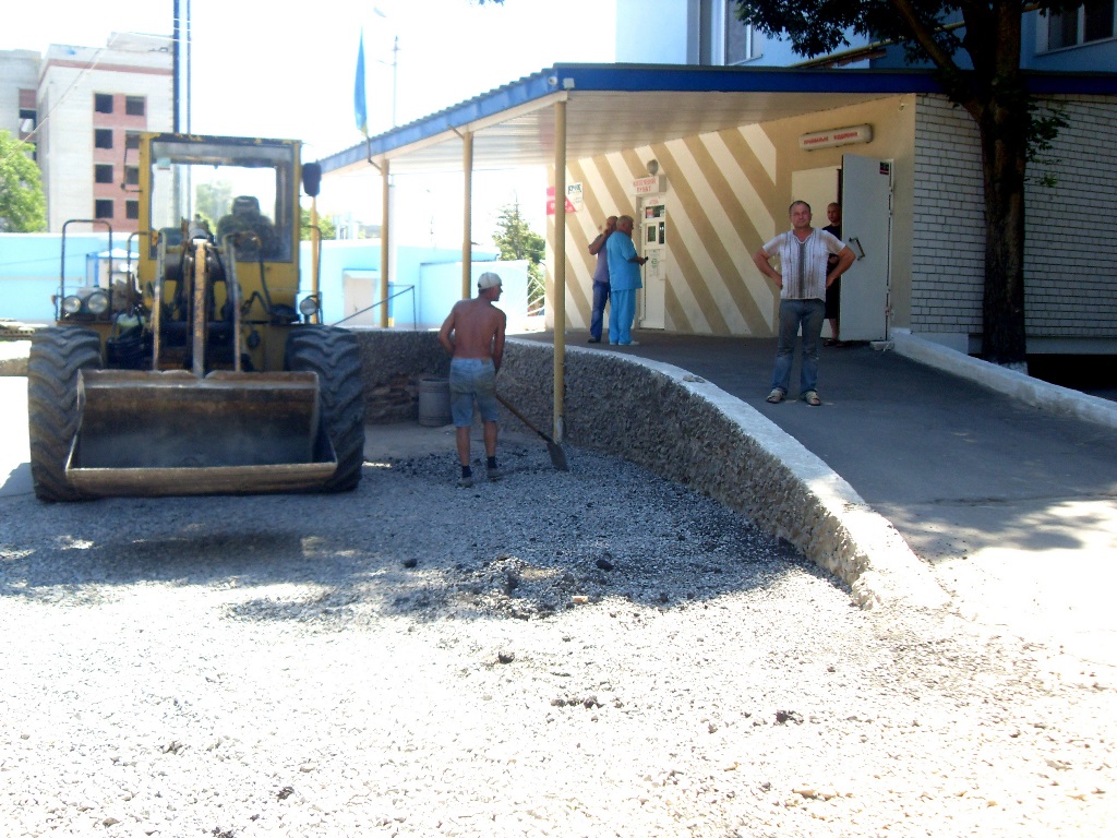 Сегодня произведено восстановление асфальтового покрытия на участке вблизи приёмного отделения, входа в стационарный корпус и приёмного покоя детского отделения.
