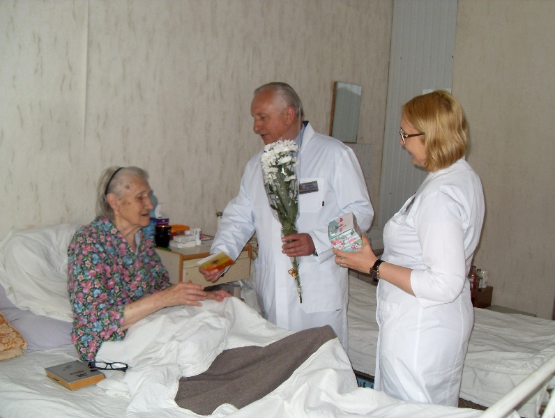 К сожалению, к 73-ой годовщине Победы живых фронтовиков, участвовавших непосредственно в боях, осталось очень мало. Среди бывших сотрудников больницы числится 30 участников войны – большей частью это люди, трудившиеся в тылу для фронта, рождённые в военные годы на оккупационных территориях, вдовы участников и инвалидов войны. В праздничные дни представители администрации больницы посетили их на дому, поздравили и поблагодарили, передав подарки, денежную помощь, цветы и поздравления от коллектива.
