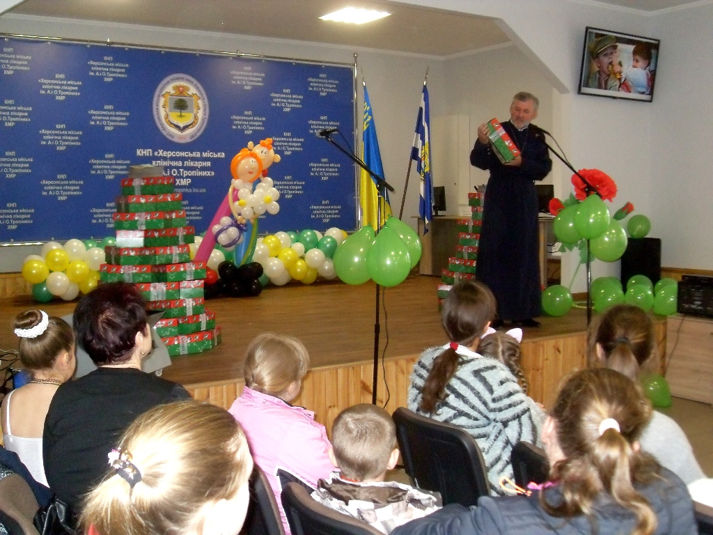 Первым приветствовал зал священник больничного храма Отец Стецюк, который говорил не новые, но очень важные слова – о том, что мы должны любить друг друга, уважать друг друга, ценить жизнь, уделять особое внимание детям и просто быть добрее. Ну а добро, милосердие и любовь – это всё и есть Бог.