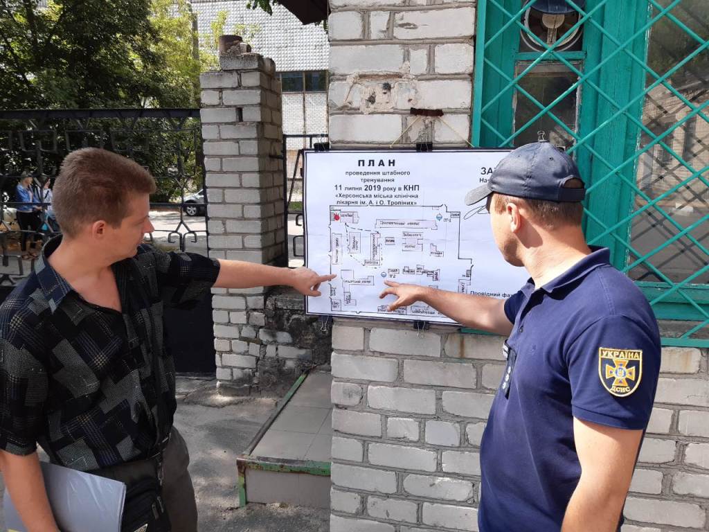 За задумом, були зімітовані три надзвичайні ситуації: отримання повідомлення від Управління СБ України в Херсонській області про загрозу здійснення терористичного акту на території лікарні; виявлення на території біля харчоблоку та виборчої дільниці сумки, схожої на вибуховий пристрій; знеструмлення ТП у лікарні внаслідок терористичного акту.